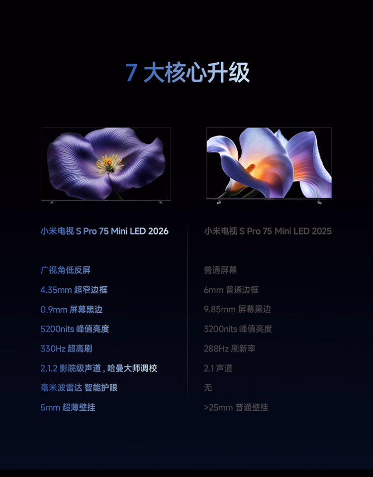 包装清单  :   小米电视S Pro Mini LED 75英寸 2026款 5200nits 2304分区 330Hz 广视角低反屏