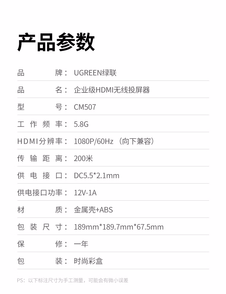包装清单  :   绿联HDMI无线投屏器高清会议同屏器适用笔记本电脑台式机接电视显示器投影仪点对点200米传输器60200