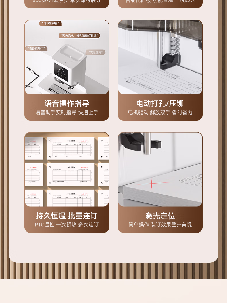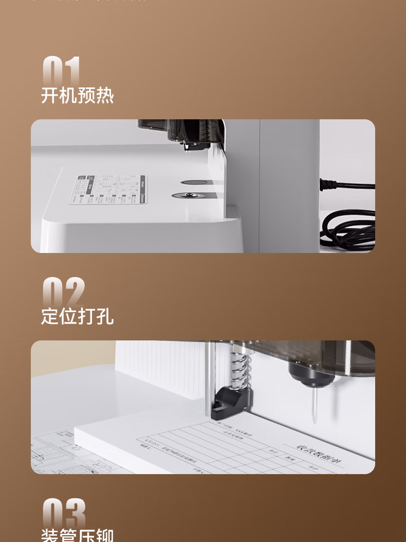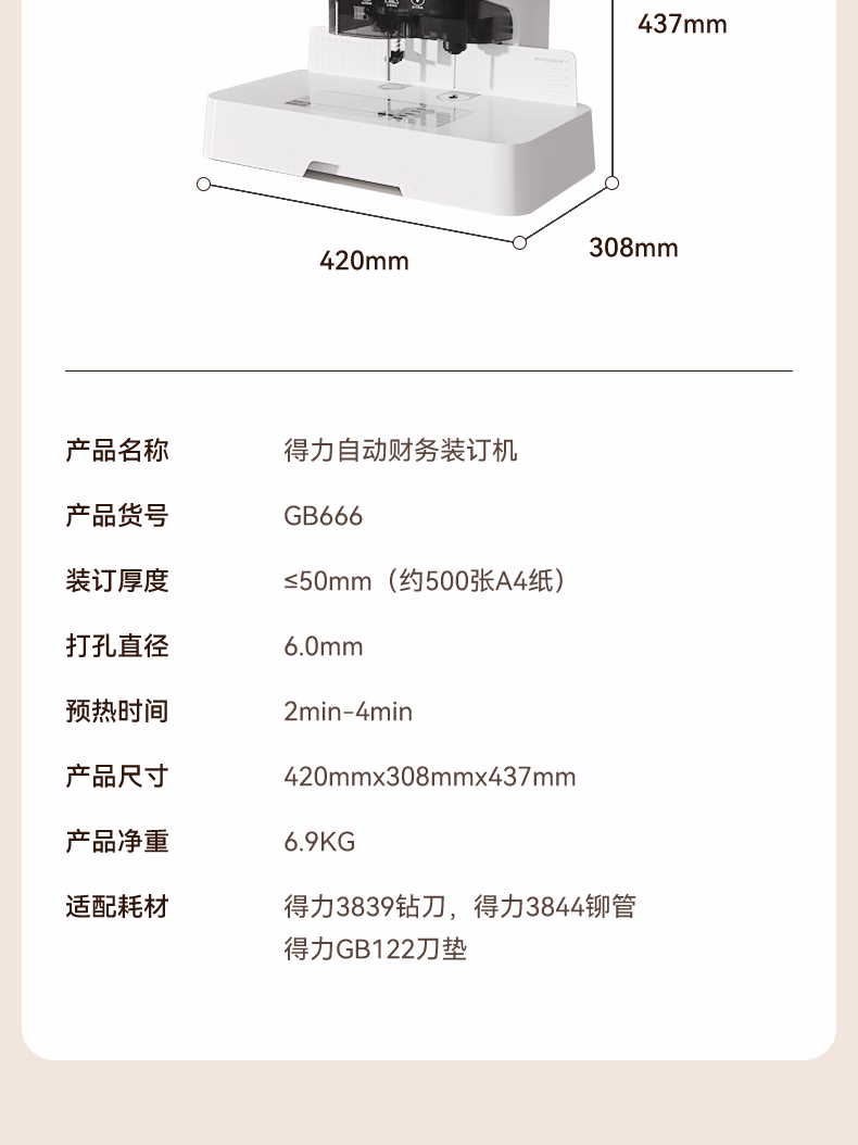 包装清单  :   得力50mm会计凭证自动装订机500页财务装订机电动打孔装订机铆管热熔装订机文件打孔器激光定位GB666