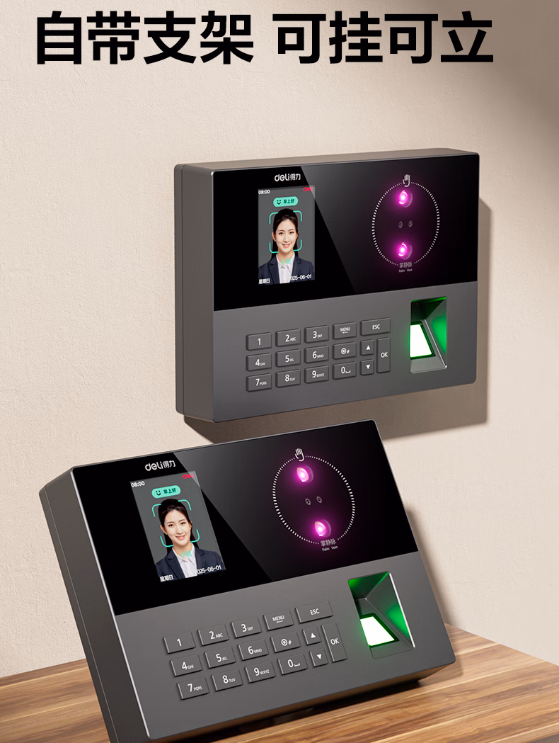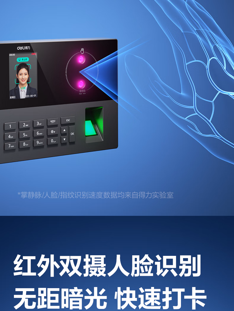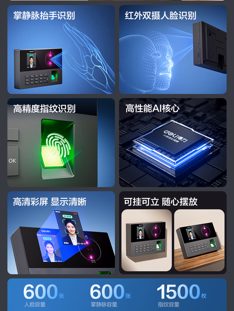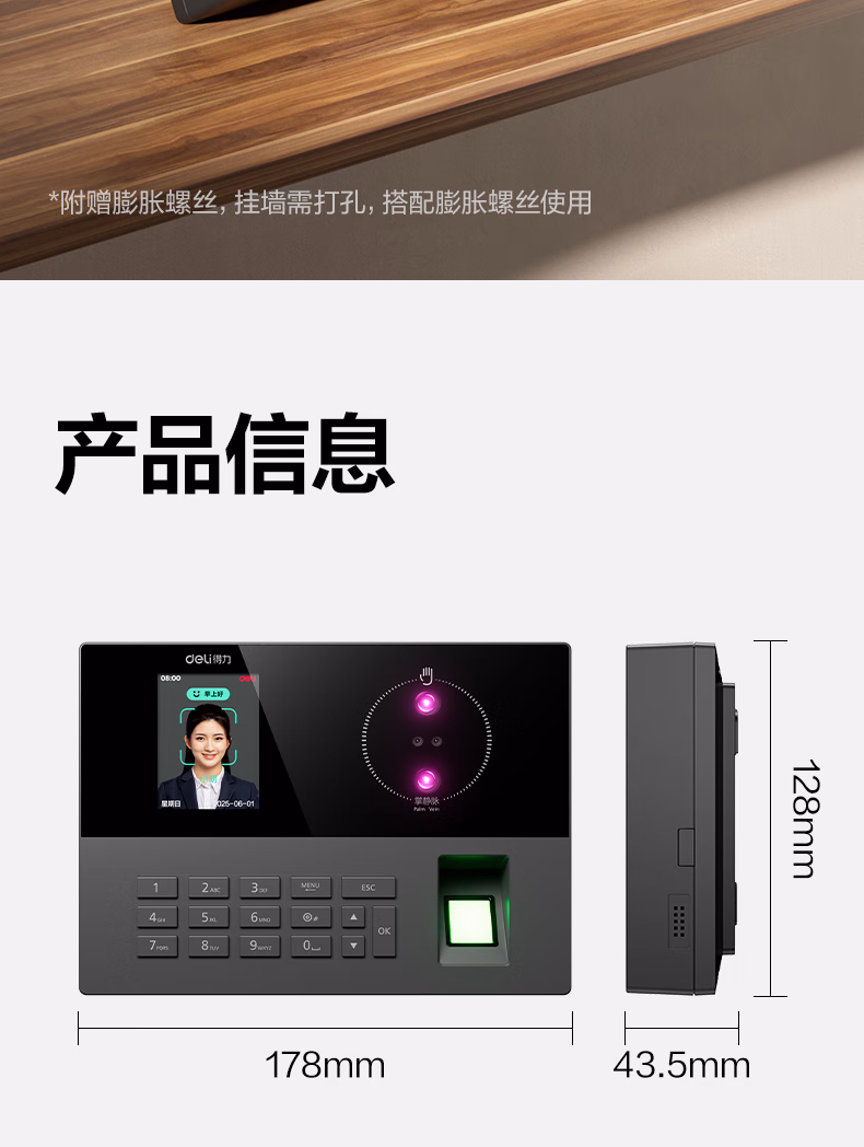 包装清单  :   得力考勤机 打卡机掌静脉+人脸+指纹红外识别考勤机 wifil联网 远程在线管理异地多店互联 AH12C 不含安装