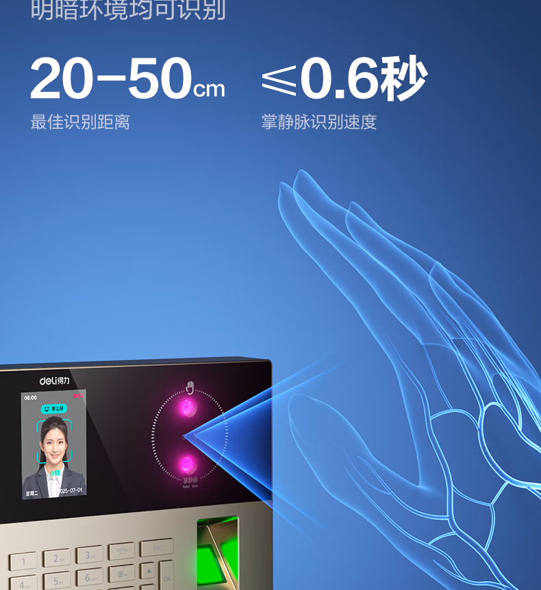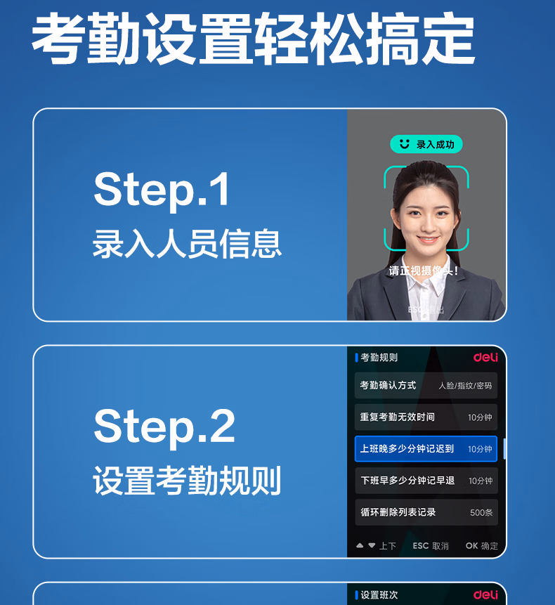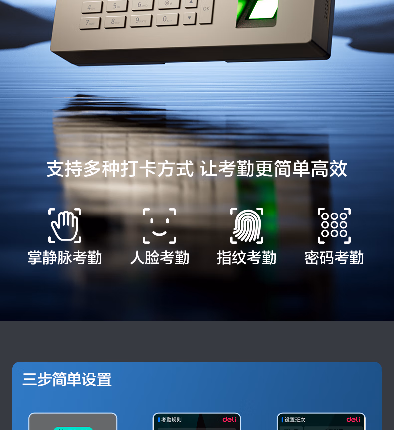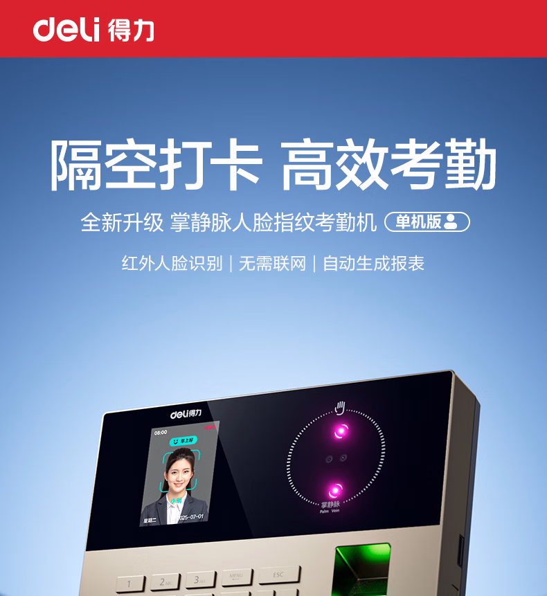 包装清单  :   得力考勤机 打卡机人脸+指纹+掌纹 免软件免网络 三步简单设置 自动生成报表 U盘导报表AH208 不含安装