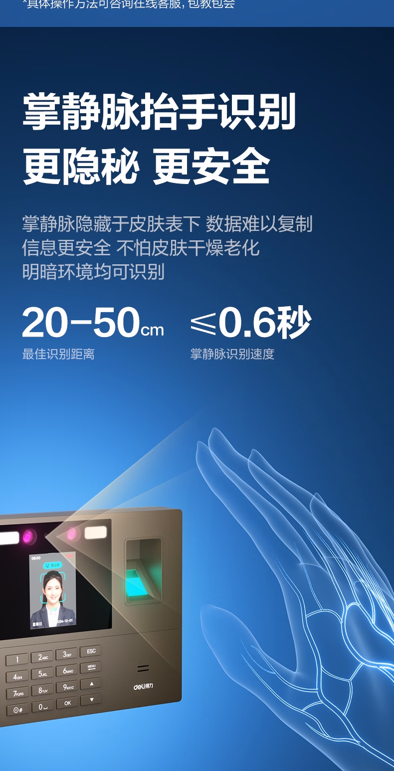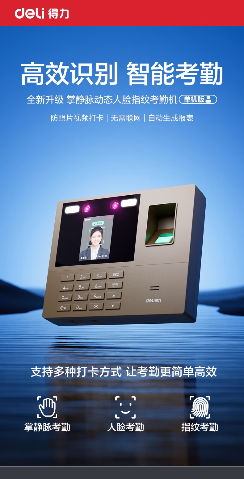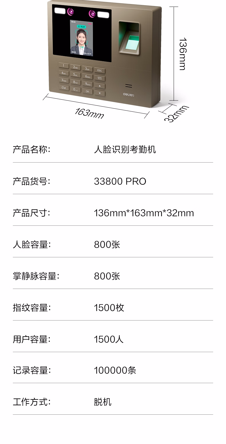 包装清单  :   得力考勤机 打卡机 掌静脉+人脸+指纹 动态人脸识别 免软件免网络 三步简单设置 自动生成报表33800PRO