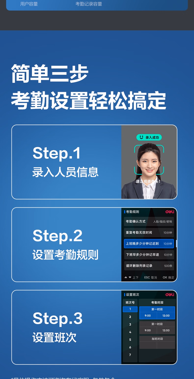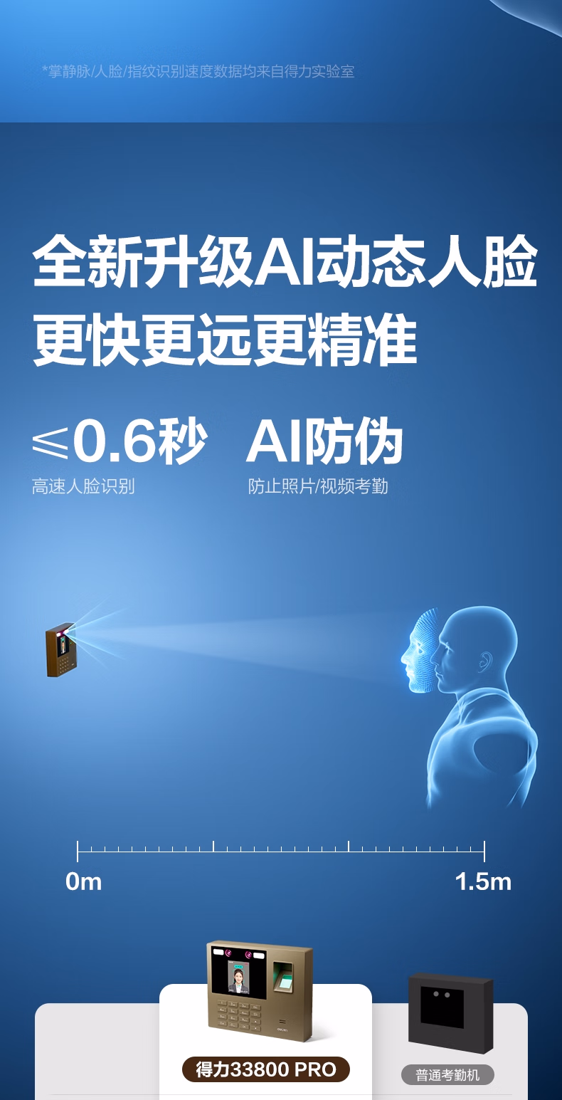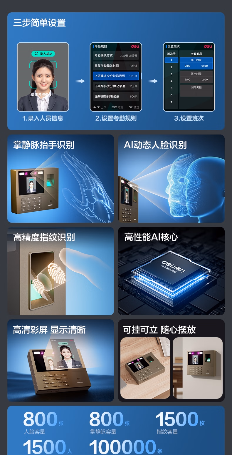 包装清单  :   得力考勤机 打卡机 掌静脉+人脸+指纹 动态人脸识别 免软件免网络 三步简单设置 自动生成报表33800PRO