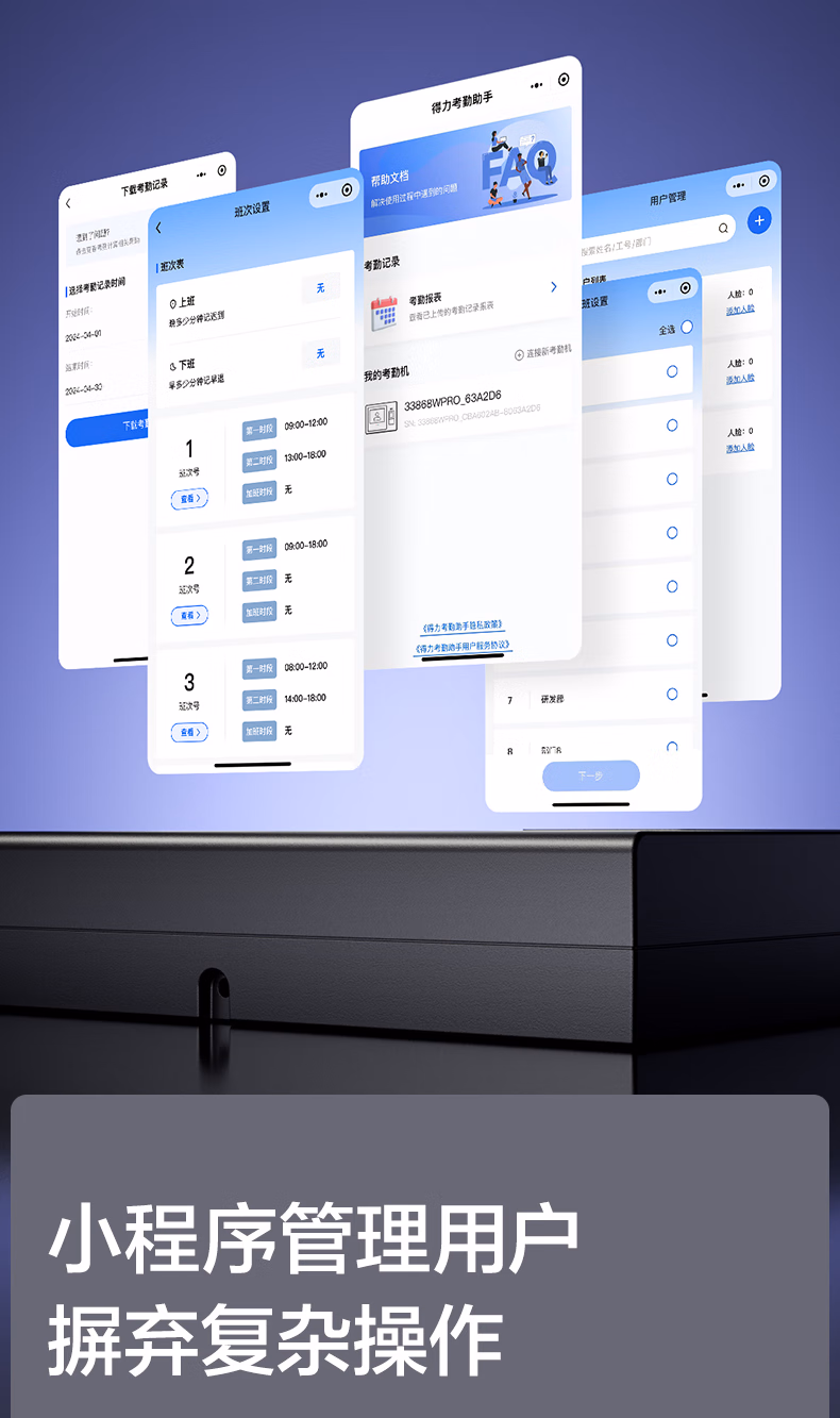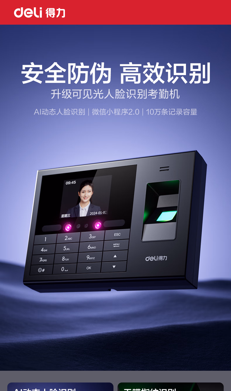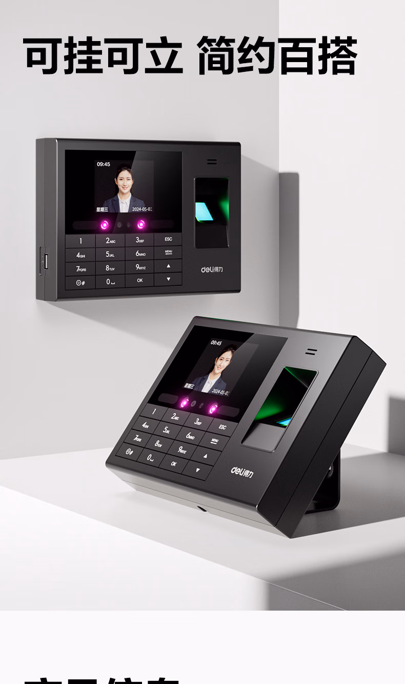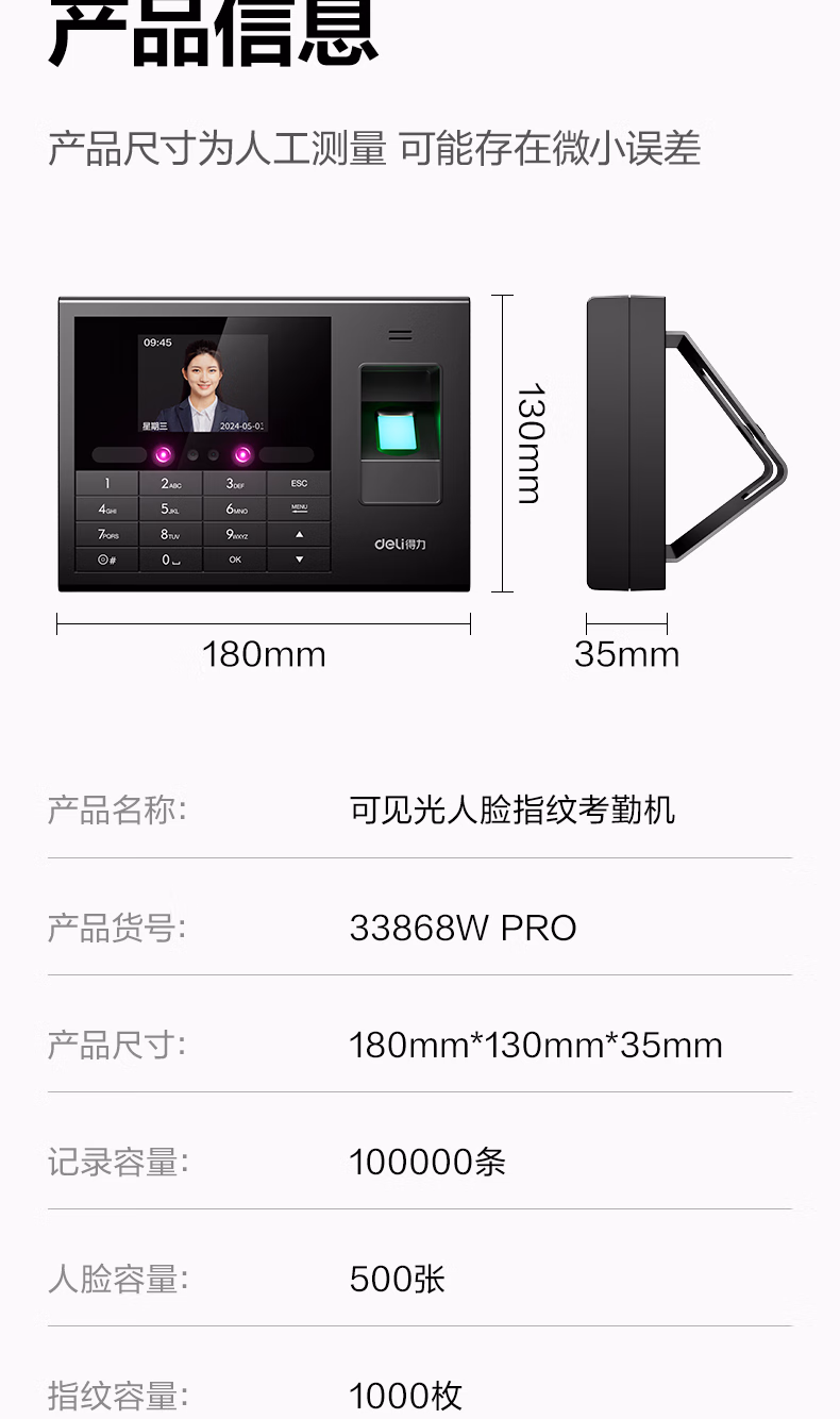 包装清单  :   得力考勤机 动态人脸+指纹识别 防照片视频打卡 蓝牙连接 微信小程序管理 可见光升级款33868WPRO