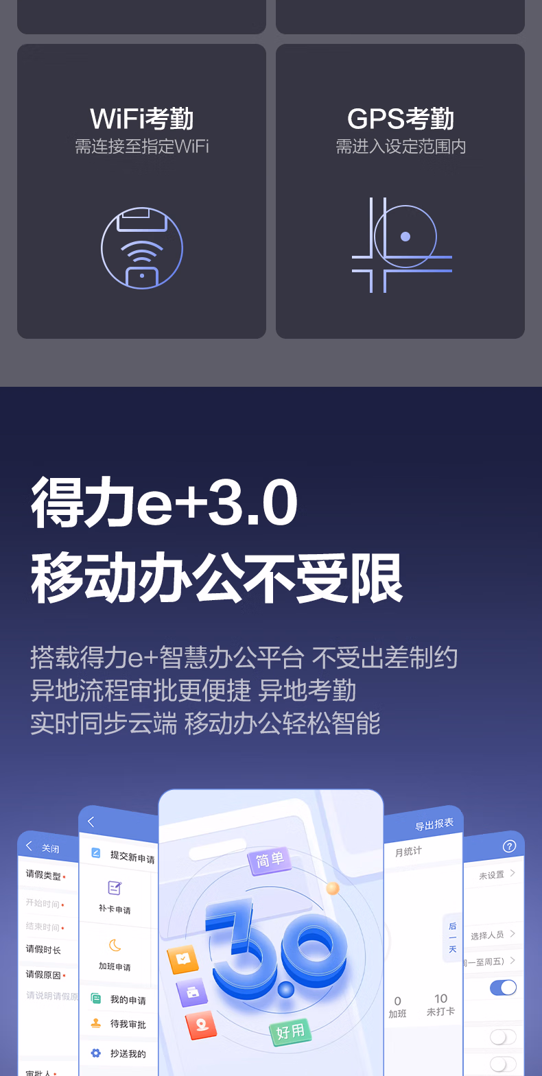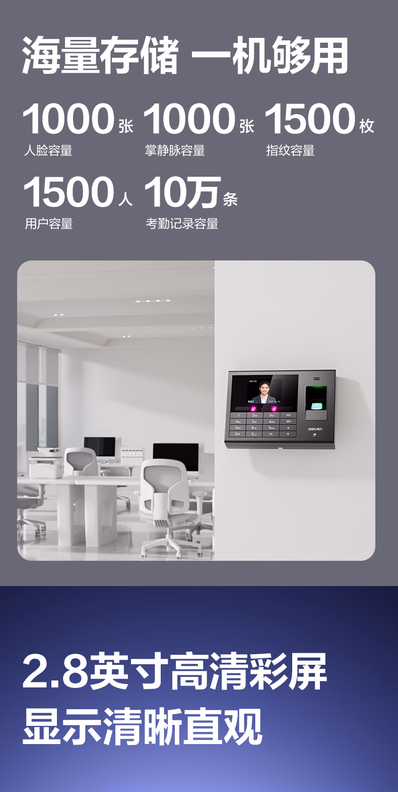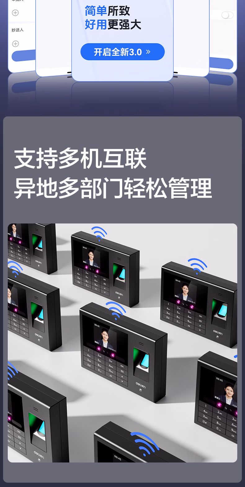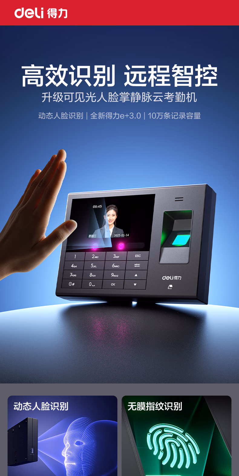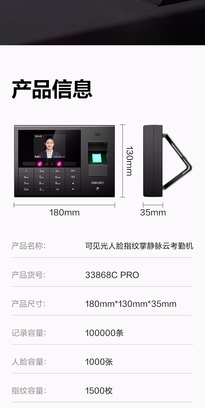 包装清单  :    得力智能云考勤机 人脸+指纹打卡 可见光动态人脸识别 wifil联网 远程在线管理 全新升级款33868CPRO