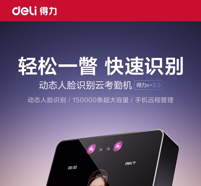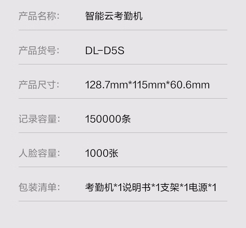 包装清单  :   得力智能云考勤机 可见光动态人脸识别打卡机 活体检测 wifi联网 远程在线管理 4英寸大屏 DL-D5S