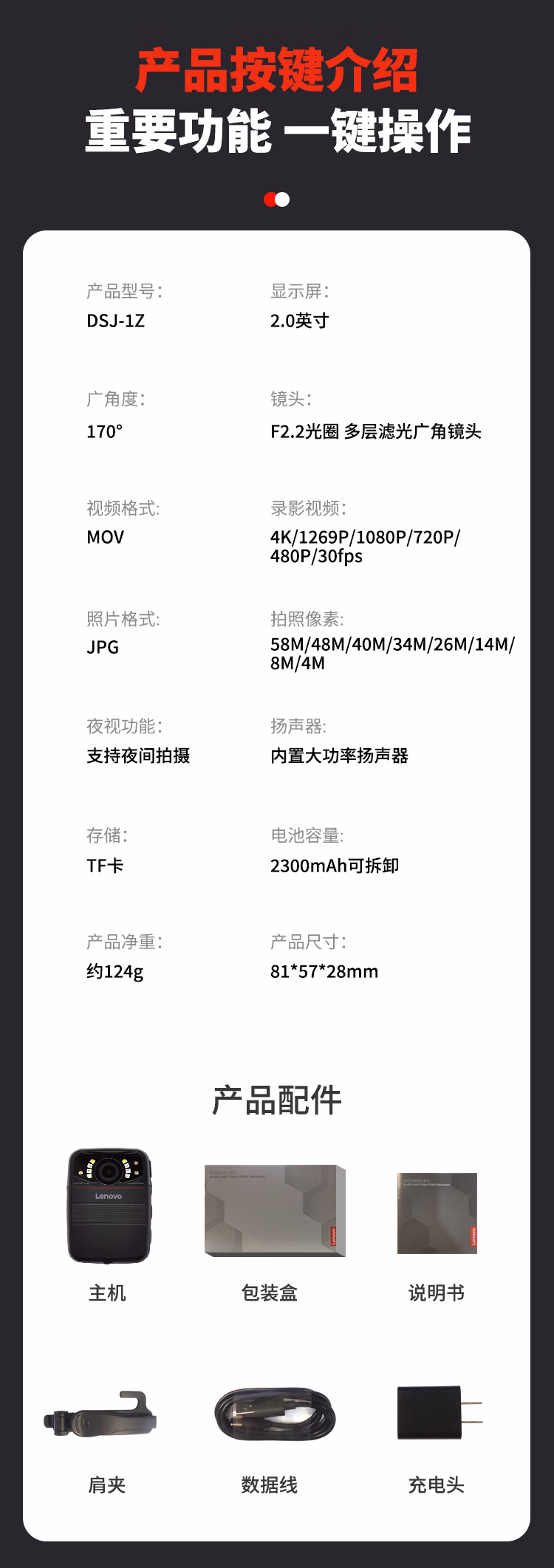 包装清单  :   联想(Lenovo)执法记录仪4K高清红外夜视5800万像素随身录像取证DSJ-1Z 32G