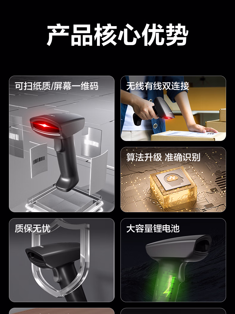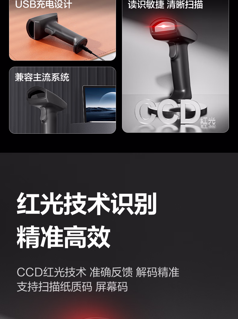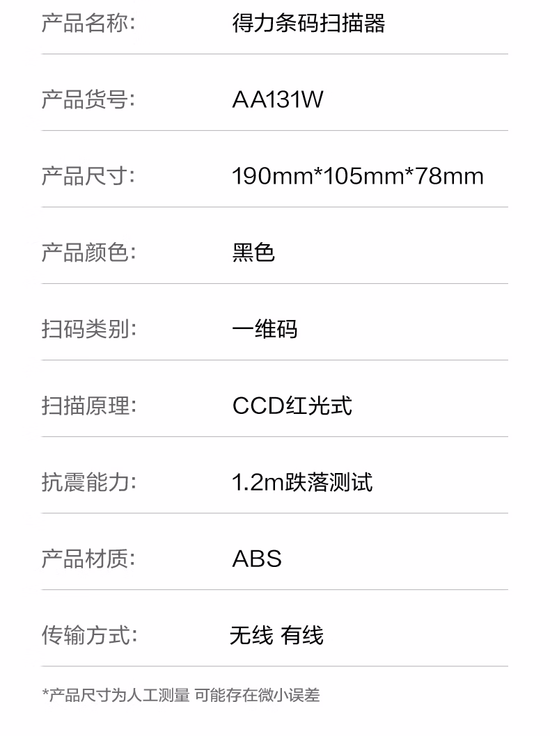 包装清单  :   得力扫码枪 一维无线扫描枪快递物流查询收款医保支付备件库盘点商品入库追溯码收银条码扫码器AA131W