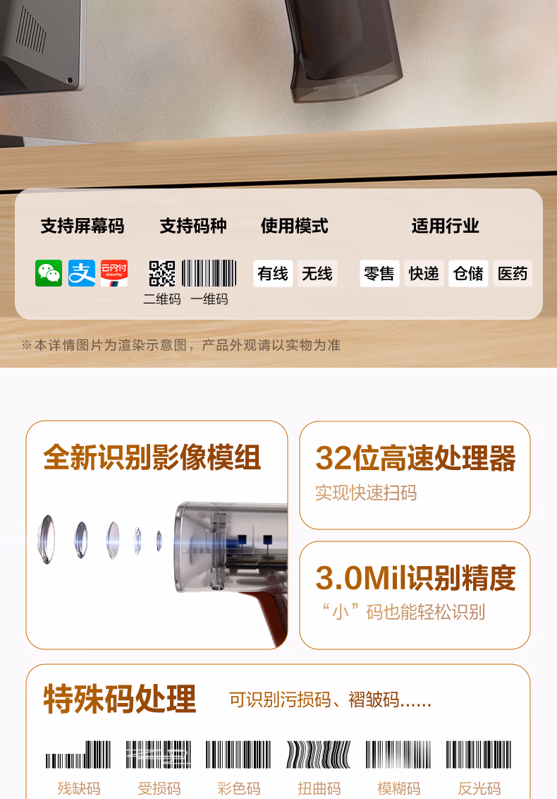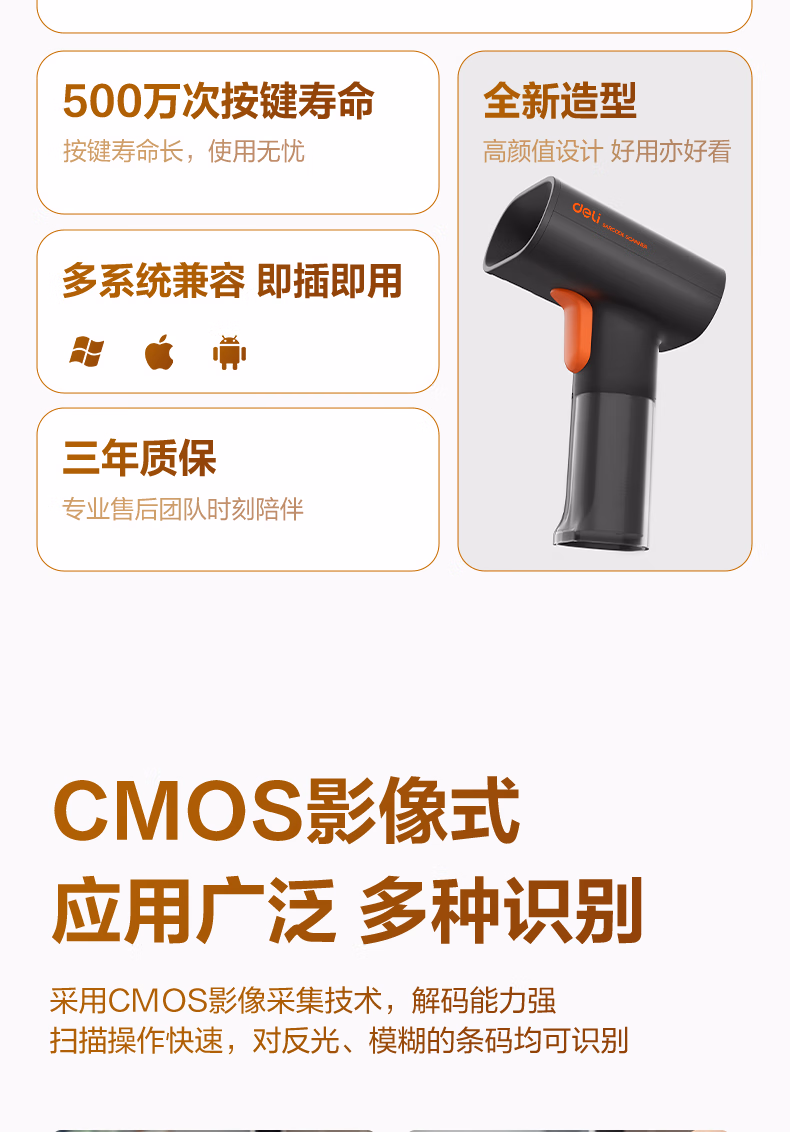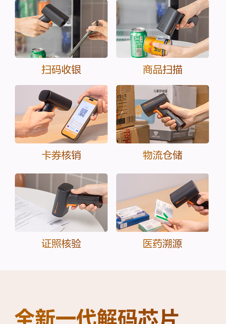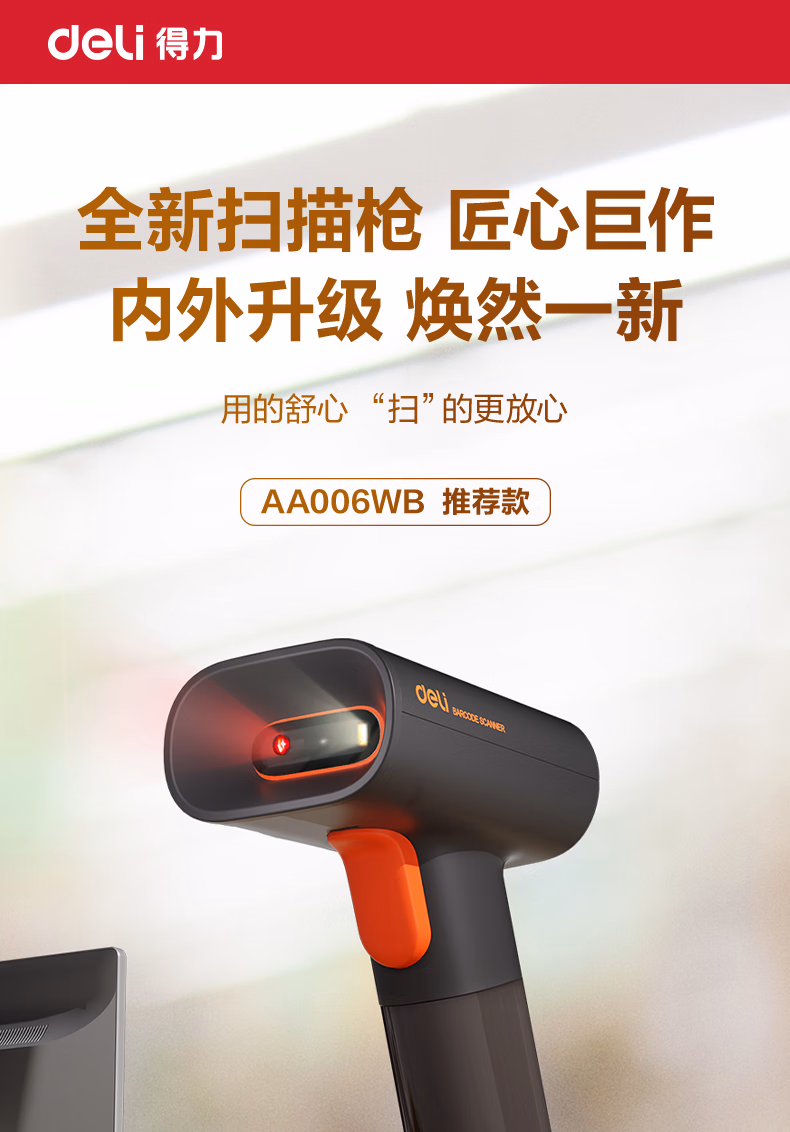 包装清单  :   得力(deli)扫码枪 二维无线扫描枪收银医保支付快递物流查询商品条码备件入库扫码器60万像素蓝牙款AA006WB