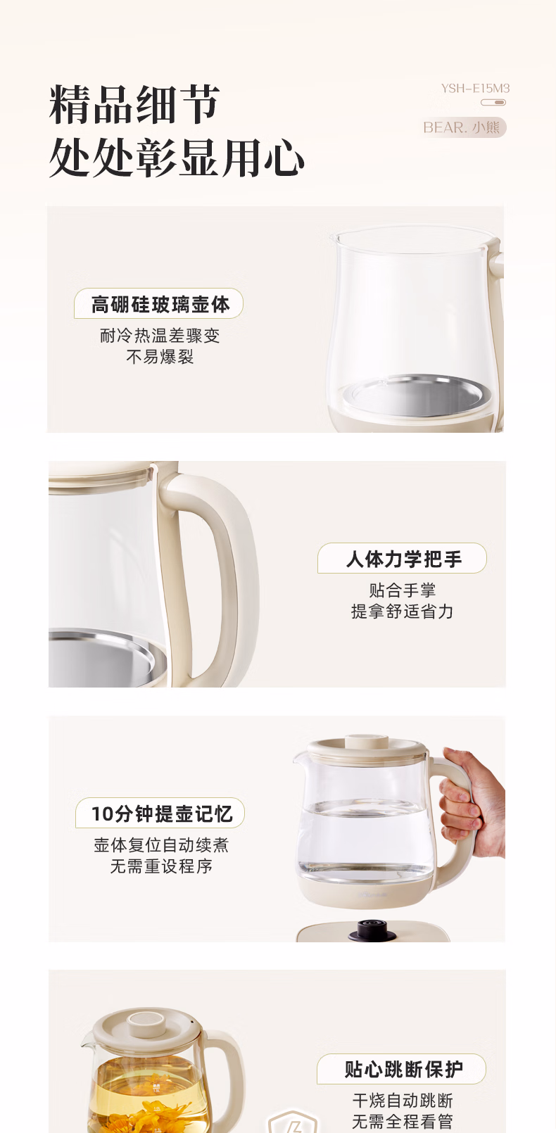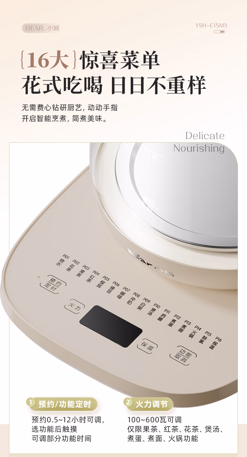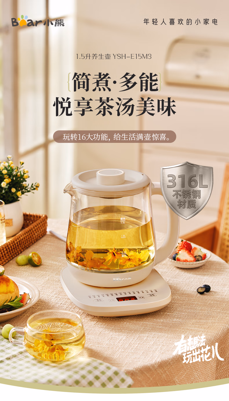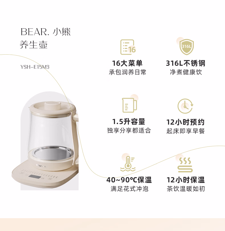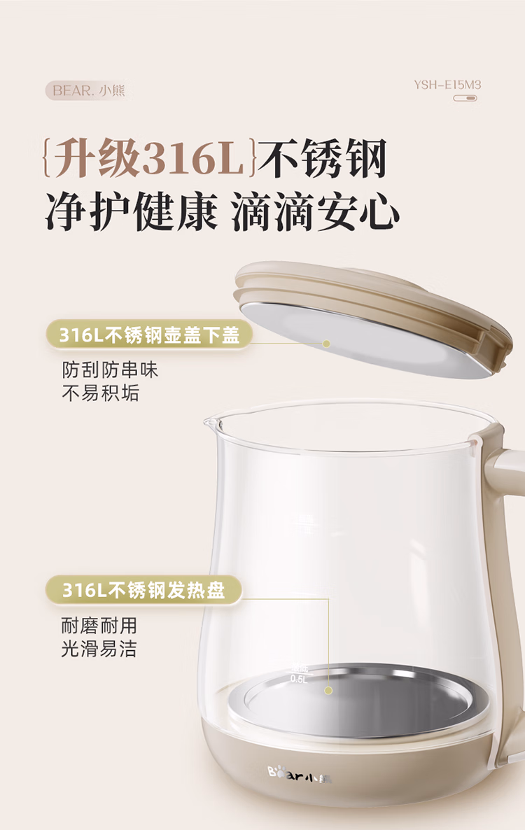 包装清单  :   小熊(Bear)养生壶 煮茶器 烧水壶 煮茶壶 316L不锈钢多段保温迷你玻璃花茶壶 智能电热水壶1.5L YSH-E15M3